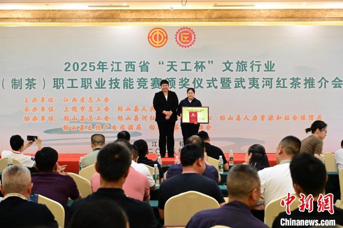 圖為江西省“天工杯”文旅行業(yè)(制茶)職工職業(yè)技能競賽頒獎儀式,楊柳(右)榮獲本次競賽一等獎。占俊玲 攝
